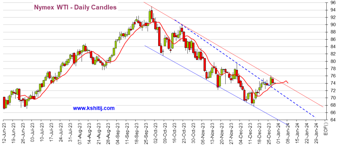 (布伦特原油期货日线图 来源:Kshitij)WTI原油期货下跌,未能突破76美元/桶。支撑位在72美元/桶。只要守住上述支撑,那么WTI油价仍有突破76美元/桶并升向78-80美元/桶的空间。