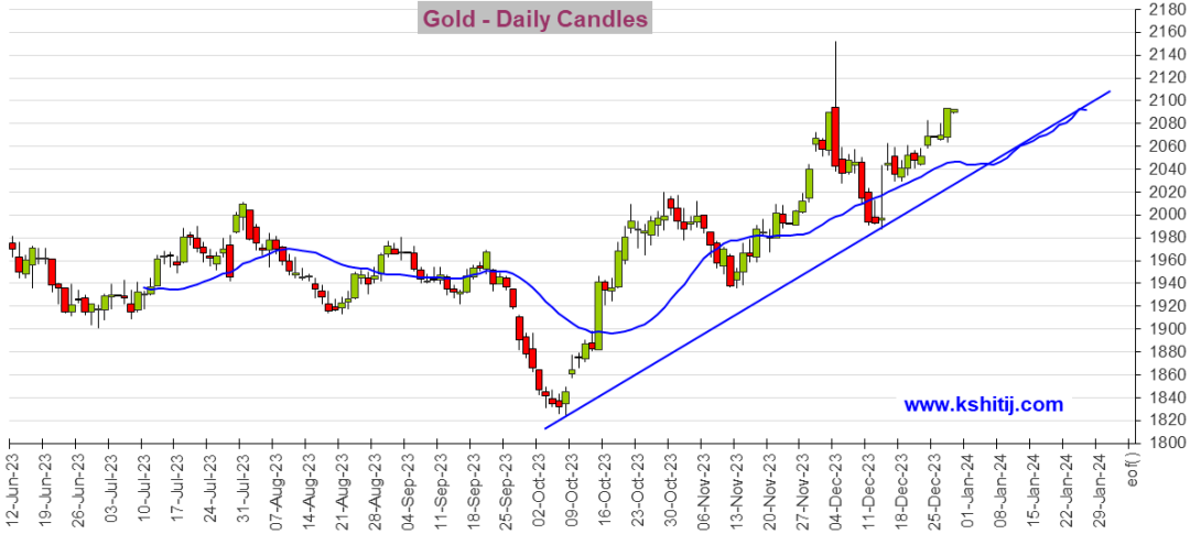 :“进入新的一年,全球央行的主题似乎是更低的利率即将到来,因此,黄金将只有上行空间。”以下是Kshitij咨询服务团队所撰文章的主要内容:黄金期货黄金期货已如预期般升向2100美元/盎司。假如无法攻克2100美元/盎司,期金可能会回落向2040-2030美元/盎司。不过,一旦突破2100美元/盎司,那么黄金期货可能涨向2125-2150美元/盎司。